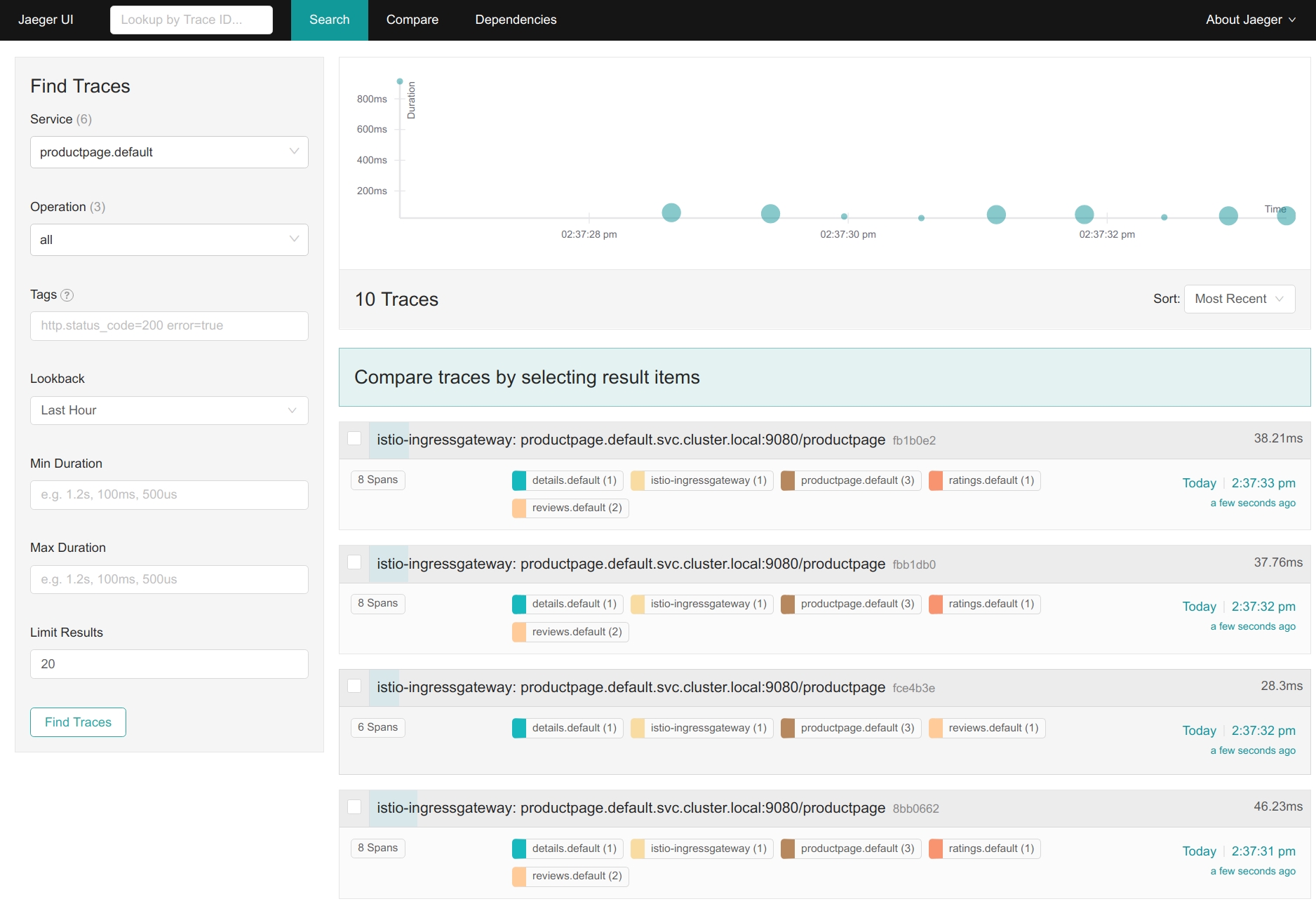 在信息中心的左侧窗格中,productpage.default从"服务"下拉列表中选择,然后单击" 查找跟踪":