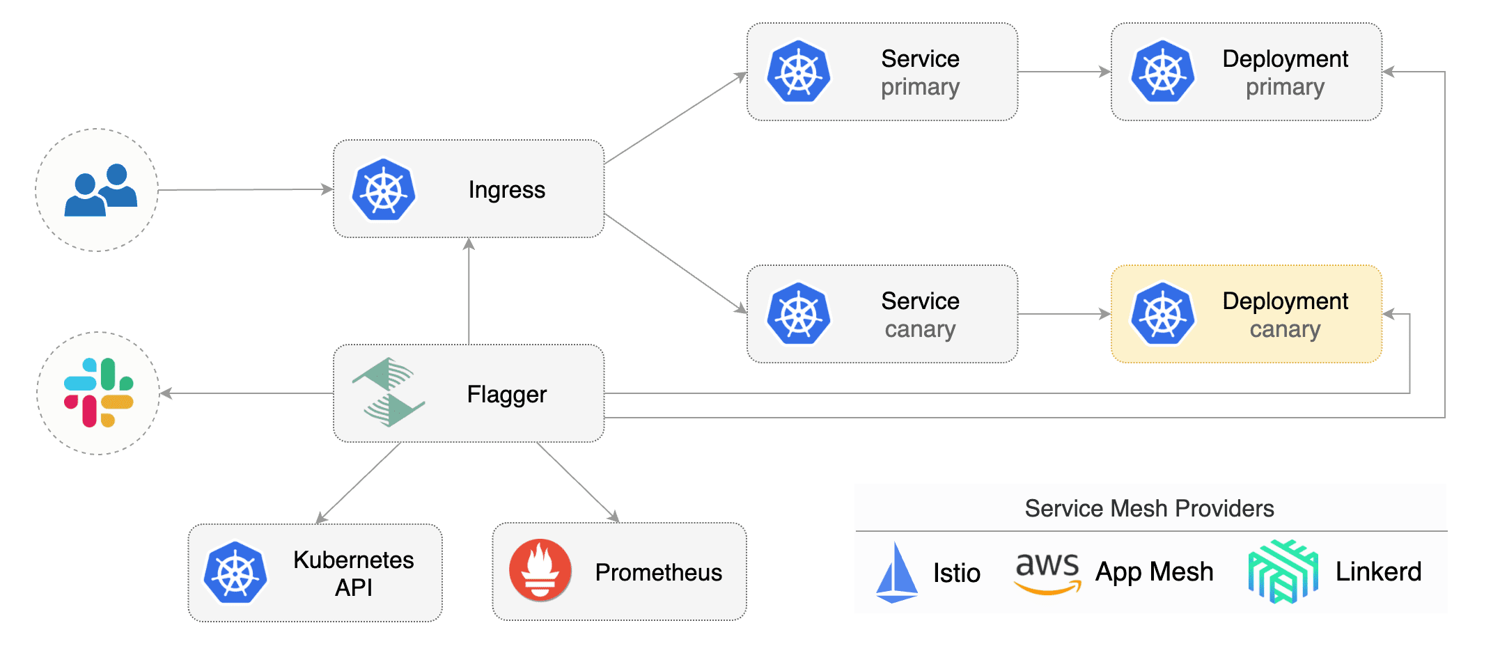flagger是一个Kubernetes操作者能够自动促进使用金丝雀部署Istio,Linkerd,应用网格,NGINX,船长,轮廓或GLOO路由流量移位和普罗米修斯度量金丝雀分析。canary分析可以通过webhooks进行扩展,以运行系统集成/验收测试,负载测试或任何其他自定义验证。